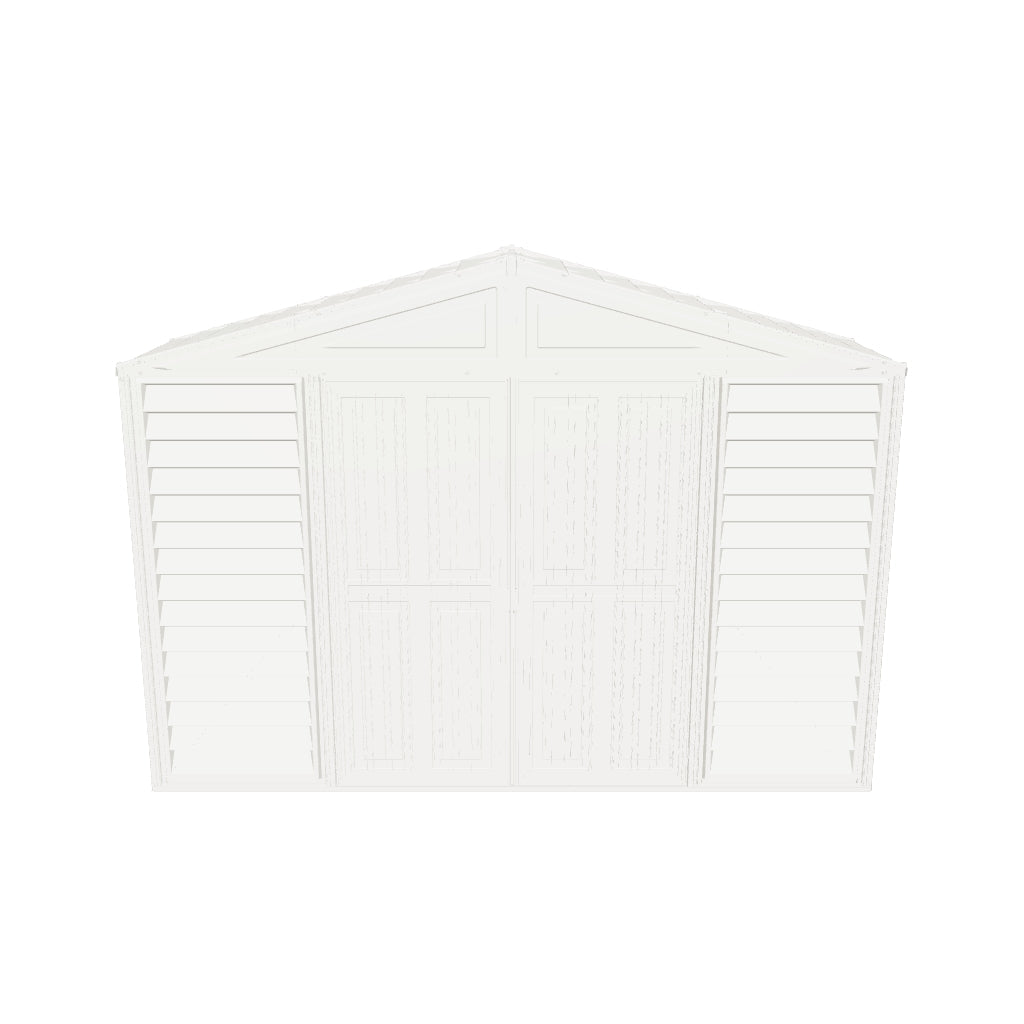 Part of the Woodbridge series, DuraMax Sheds now offers a new 10.5' x 2.75' vinyl shed for smaller storage needs. The new shed gives you the ultimate solution for storage in long slim areas! Shopping for a new shed can be tedious; there is no better value out there if you desire a real vinyl shed! This massive shed offers tall walk-in, extra wide double doors. Built with heavy duty wall columns with steel reinforcements to add superior strength, strong enough to hang garden tools on or build shelves with ease. This extra long shed provides a unique solution for odd spaces. Use along side your house, fence or even get organized inside for garage and basement storage closet needs. *plywood flooring pictured not included